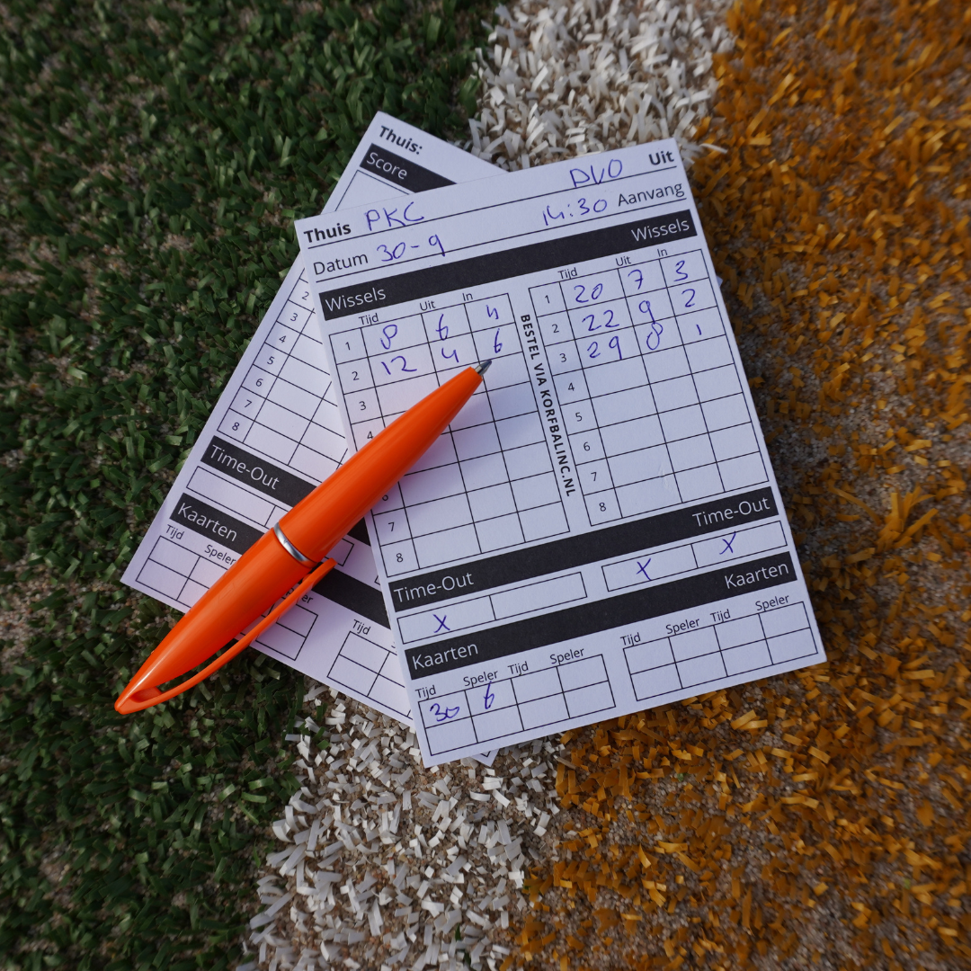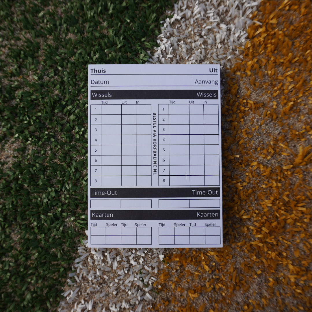 De Volledig‑variant registreert score, wissels, time‑outs en kaarten op één bladzijde per wedstrijd. De Score‑variant focust exclusief op doelpunten en periodestanden voor snelle rapportage. Zonder Score is ideaal in combinatie met een scorehorloge en biedt ruimte voor wissels, time‑outs en kaarten. Elk blad is gelijmd aan de bovenzijde zodat je het na de wedstrijd eenvoudig afscheurt en bewaart. Versie 2 heeft ruimere invulvelden, stevigere paginapapier en afgeronde hoeken om snel terug te bladeren. Van versie 1 (25 vellen, 7,5 × 9 cm) is een kleine restvoorraad beschikbaar zolang de voorraad strekt.